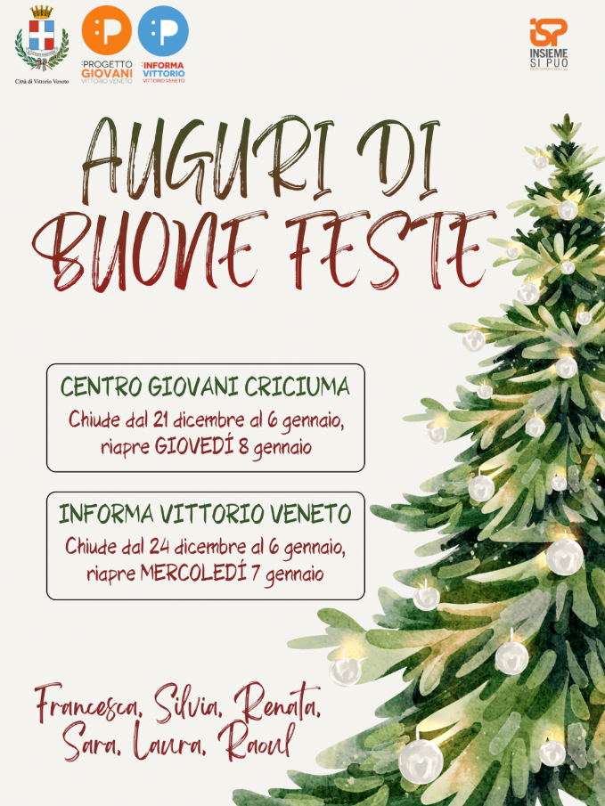 Centro Giovani Criciuma e InformaVittorioVeneto chiudono per le festività natalizie.