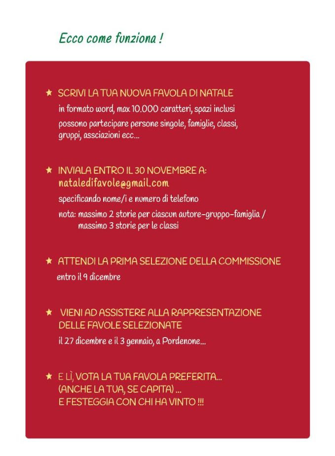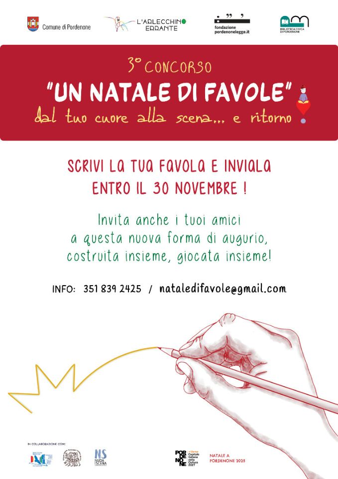 Torna il Concorso per la scrittura di Nuove Favole di Natale con la produzione del Comune di Pordenone, e la collaborazione di pordenonelegge.it e della Biblioteca Civica, verranno accolte le proposte di tutti, classi scolastiche, singoli, gruppi o famiglie…